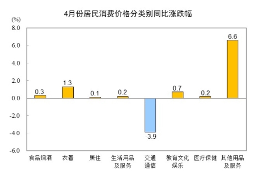 其他七大类价格同比六涨一降。其中,其他用品及服务、衣着、教育文化娱乐价格分别上涨6.6%、1.3%和0.7%,生活用品及服务、医疗保健、居住价格分别上涨0.2%、0.2%和0.1%;交通通信价格下降3.9%。