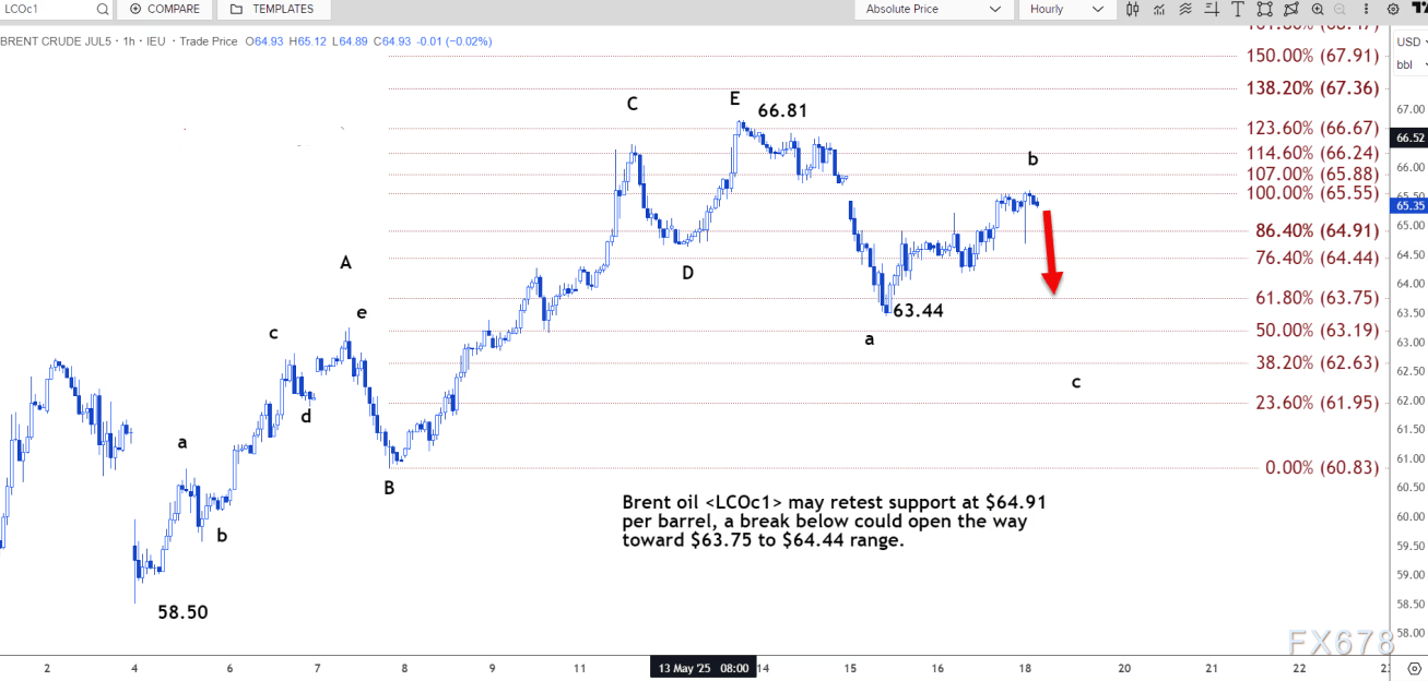 路透技术分析师指出,布伦特原油可能重新测试每桶 64.91 美元的支撑位,跌破该水平可能打开通往 63.75 美元至 64.44 美元区间的道路。