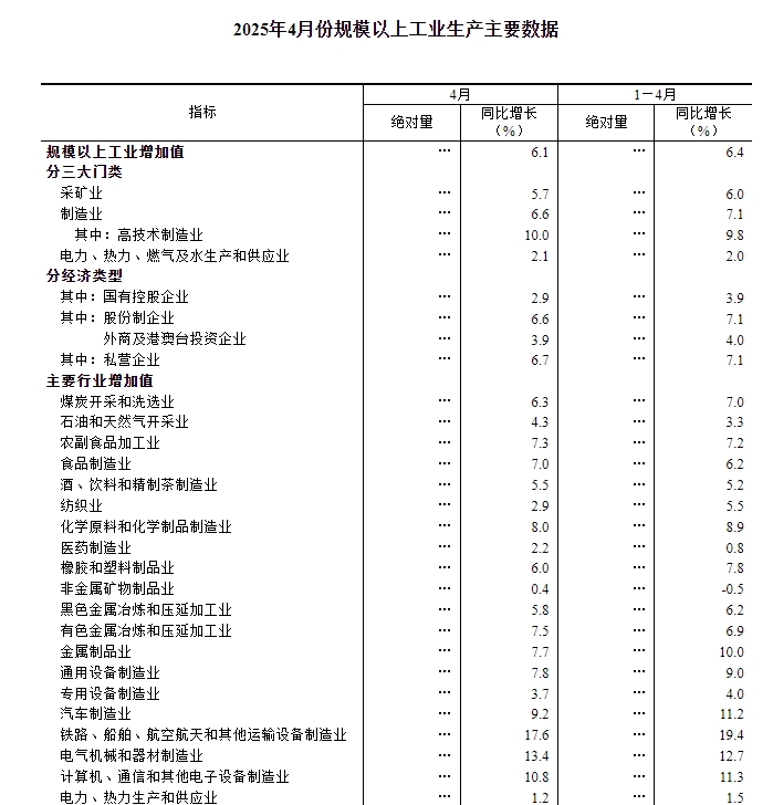 分三大门类看,4月份,采矿业增加值同比增长5.7%,制造业增长6.6%,电力、热力、燃气及水生产和供应业增长2.1%。