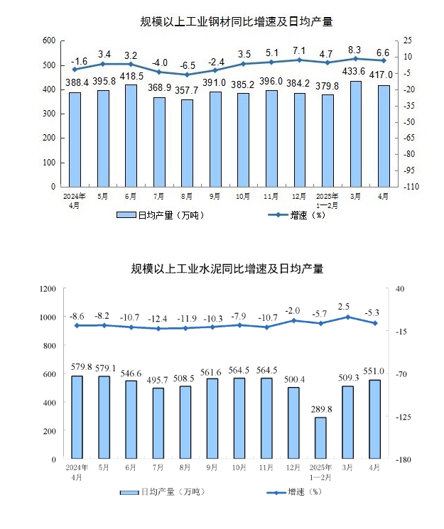 分产品看,4月份,规模以上工业623种产品中有341种产品产量同比增长。其中,钢材12509万吨,同比增长6.6%;水泥16530万吨,下降5.3%;十种有色金属676万吨,增长3.1%;乙烯298万吨,增长10.1%;汽车260.4万辆,增长8.5%,其中新能源汽车122.8万辆,增长38.9%;发电量7111亿千瓦时,增长0.9%;原油加工量5803万吨,下降1.4%。