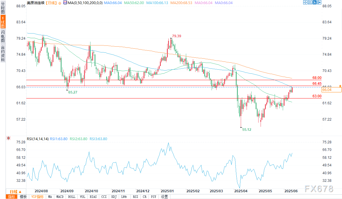 周三(6月11日)欧盘时段,WTI原油期货价格飙升,延续了周二的涨势,但未能触及66.45美元重要水平。目前多头正关注能否明确突破技术阻力位,以确认持续上涨趋势。
