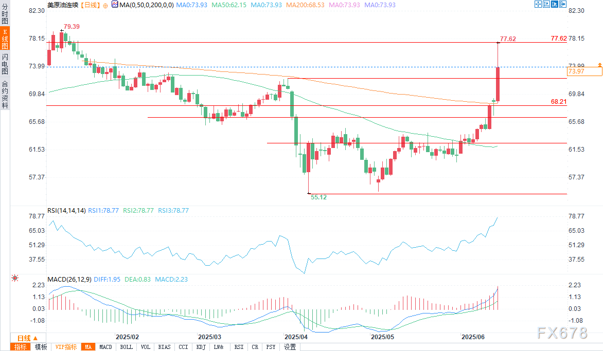 这是两个合约逾两年来最大的单日涨幅。WTI目前在78.09美元和80.47美元附近面临强劲阻力,支撑位则在71.17美元,更深层次支撑在68.21美元及200日均线附近的66.45美元。