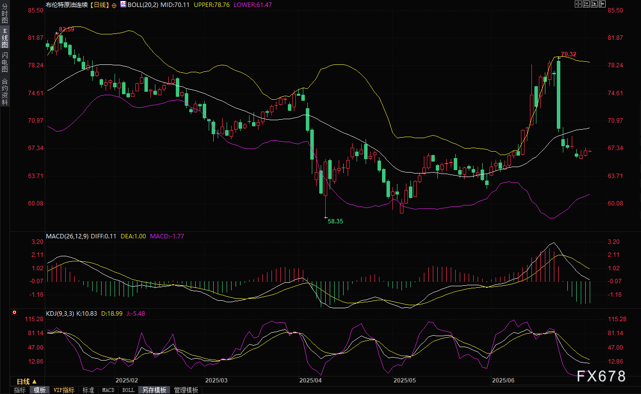 然而,自6月25日以来,布伦特原油价格一直在每桶69.05美元的高点与66.34美元的低点之间震荡,显示出市场对地缘政治风险的担忧已基本被消化。