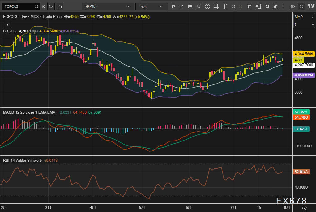 VT外汇官网——周三(7月30日),马来西亚衍生品交易所(BMD)棕榈油主力合约FCPOc3延续反弹,10月合约收报4277林吉特/吨,日内涨幅0.54%,连续第二日上行。技术指标显示,价格站稳布林通道中轨(4207林吉特)上方,MACD柱状图收窄至-2.62,RSI(14)维持在59.01的中性偏强区间,短期市场呈现多空拉锯态势。