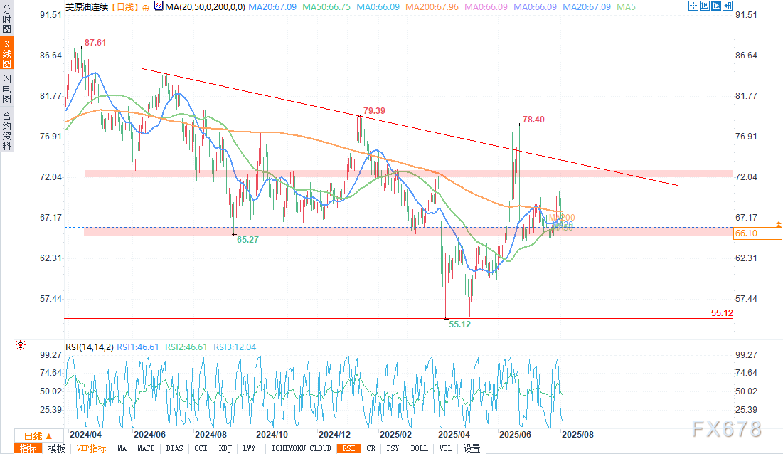 周一(8月4日)欧盘时段,轻质原油期货低开,跌破关键的短期支点67.31美元,这预示着可能会出现更深幅度的回调。上周的反弹曾短暂将价格推升至70.51美元。