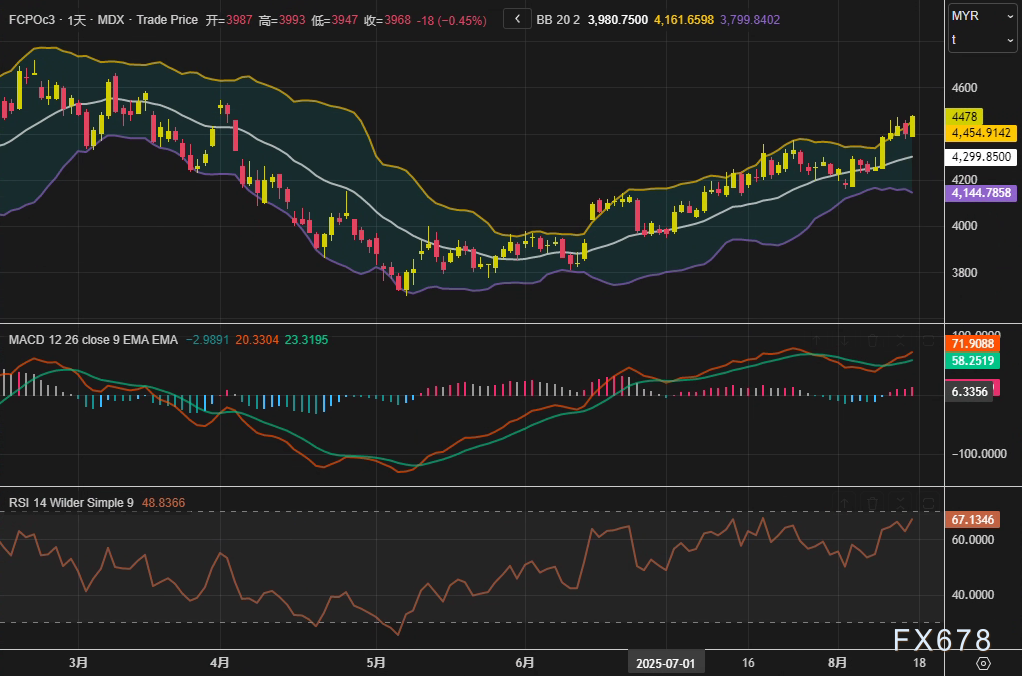 周五(8月15日),马来西亚衍生品交易所(BMD)棕榈油主力合约FCPOc3收报4478林吉特/吨,单日涨幅1.7%,周线累计攀升5.24%,创下近两个月最大单周涨幅。技术面上,价格突破布林带中轨(4161林吉特),但MACD柱状图仍处零轴下方,RSI(14)报48.84,显示市场虽短期走强,但中期动能尚未完全扭转。