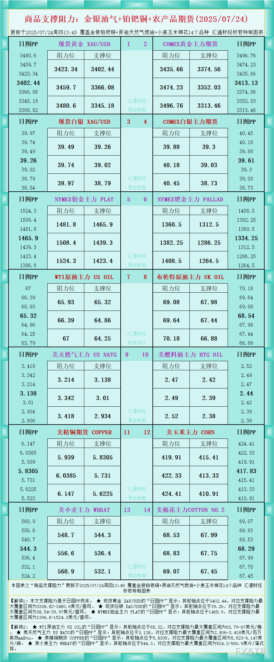 一张图看商品支撑阻力:金银油气+铂钯铜+农产品期货,更新于2025年7月24日周四13:45,具...